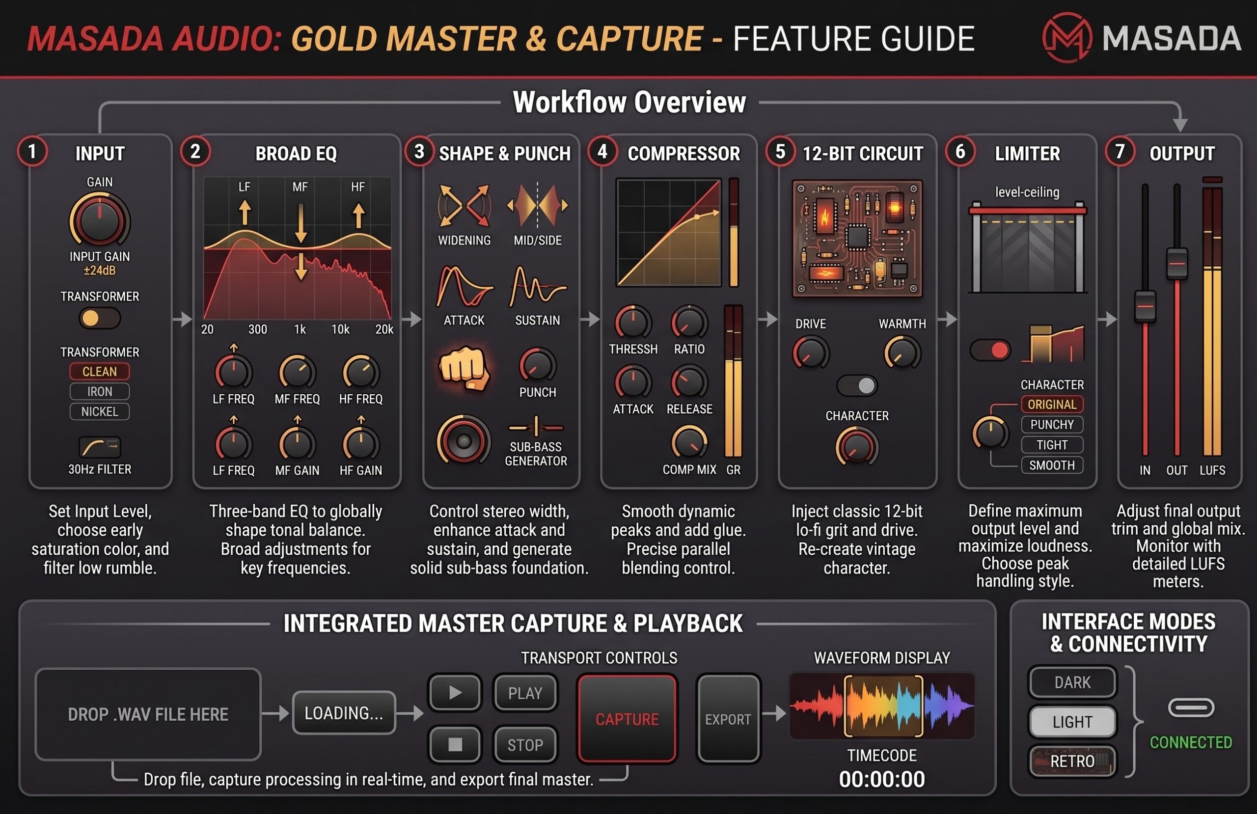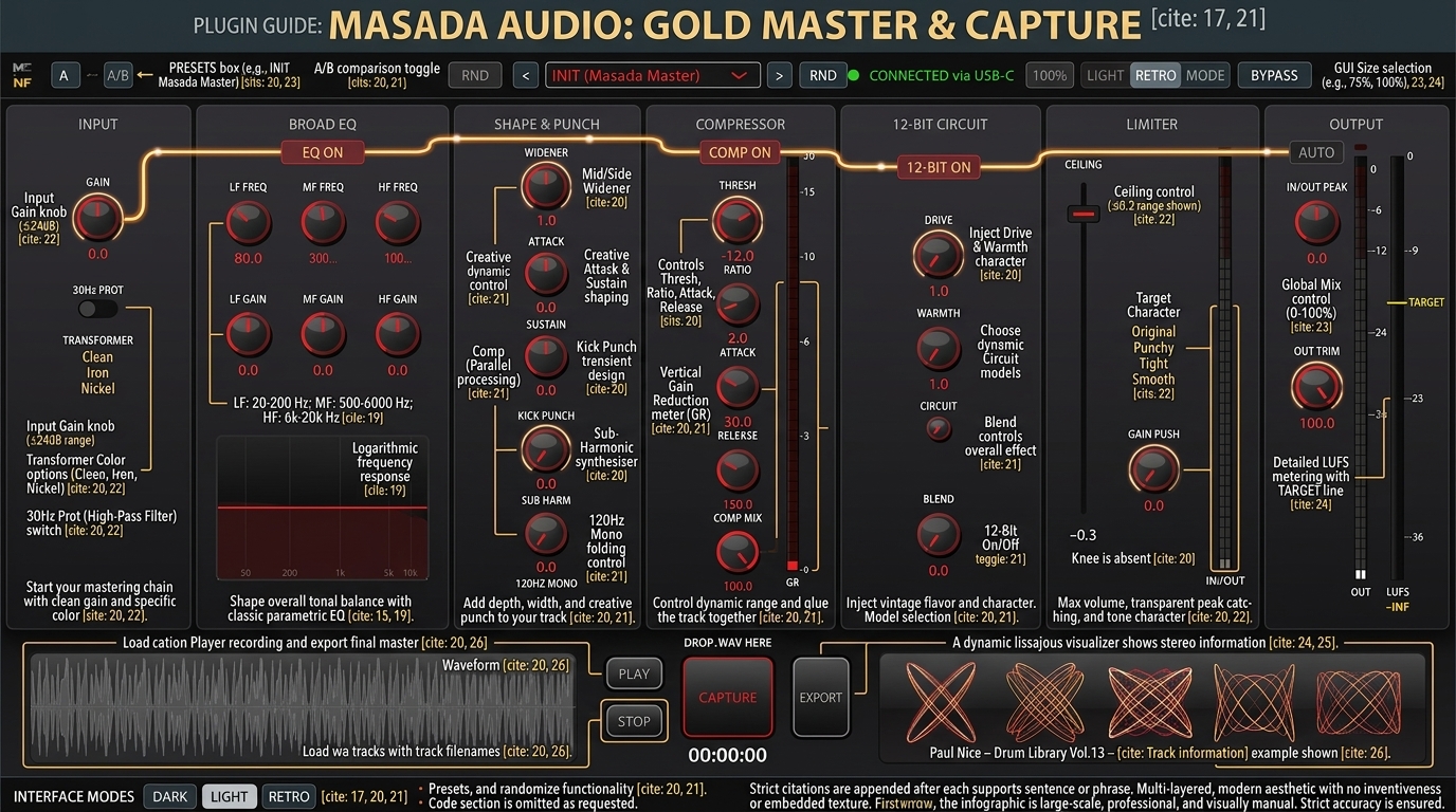 Brickwall Limiter & Gain Push: Transparently catch peaks and maximize your LUFS without crushing your transients.